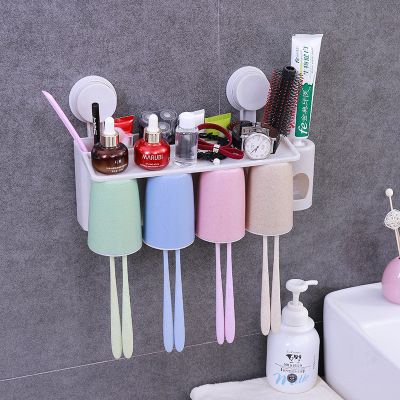 掛壁自動擠牙膏架四口之家牙刷架吸壁式洗漱收納盒牙刷杯 |