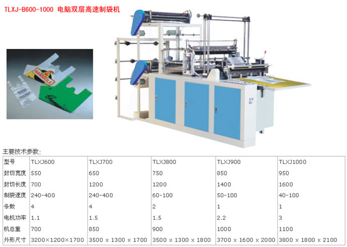特點本機特別設計為點斷連卷平口袋及點斷連卷背心袋雙用機。利用電腦控制,步進(伺服)定長系統使封切尺寸誤差小。裝置電眼追蹤使印刷袋之圖案位置精確??蛇x擇電腦數控調整袋子長度,印刷袋一有問題本機自動停機及發出警告聲。