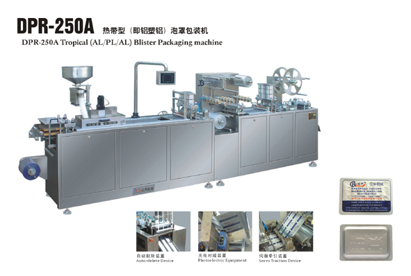 DPR-250A熱帶型(即鋁塑鋁)泡罩包裝機應用兩項國家專利技術。可進行鋁塑、鋁鋁、鋁塑鋁三種不同的包裝,達到一機三用的目的。