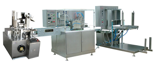 該生產線有自動裝盒機、薄膜捆包機、自動裝箱機組盒而成,是鋁塑泡罩包裝機的后繼設備,由裝盒機將藥板或裸瓶自動裝入紙盒,由薄膜捆包機進行自動將紙盒捆包,由裝箱機將已捆成中包的紙盒自動裝入大紙箱內,單機之間聯接由輸送帶自動輸送到位,從而完成聯線生產。