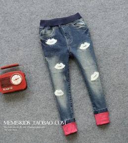 女童秋款新款韓版嘴唇繡線時尚玫紅卷邊牛仔褲鉛筆褲潮褲童裝湖州