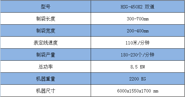 1. HSG-450X2 此機采用雙伺服電機,同步雙道運行,高速平穩。 ![]() 袋子圖示: ![]()