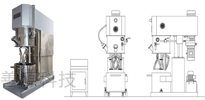 工作原理: 雙行星分散混合機工作過程中,兩根螺旋線攪拌槳按照設定的固定旋轉比例進行旋轉,螺旋槳葉在攪拌罐內公轉的同時又能快速自轉,攪拌罐內隨公轉同步運轉的回旋四氟刮刀不停旋轉,高粘度物料由攪拌罐內壁附近移動到攪拌槳運動軌跡范圍之內,攪拌器的公轉與自轉方向,既可同向也可逆向,達到不同的剪切攪拌目的。另外,兩根高速自轉的高速分散盤,隨著整體公轉一起沿攪拌罐內運轉,進行高效分散,高速分散盤為變頻調速,可根據生產工藝自行調整轉速。特有的真空粉體輸送集成技術,可實現無粉塵添加粉體材料的目的。
